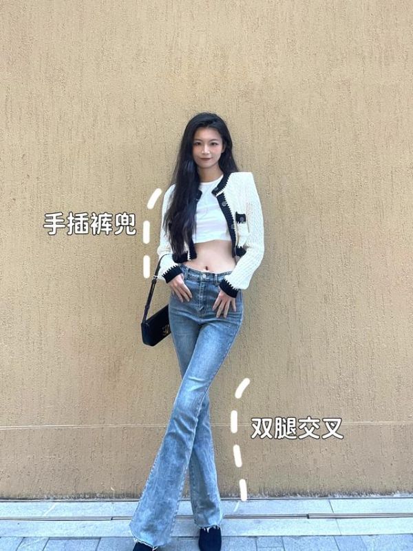 找到一面纯色的墙面,双腿交叉站在镜头前,双手自然插裤兜,让肩膀呈现一前一后,双腿交叉站,视觉上有效拉长腿部线条,即便腿型不好看也能拍美照。