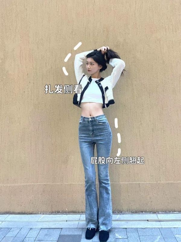 脸型好看的姐妹就不要让头发遮住自己的脸,双手顺势扎起头发,眼神看向侧边,露出自己好看的侧颜,臀部向一侧翘起,这样身体的曲线能够更好地显现出来,好身材和清晰的下颚线条轻松拍。