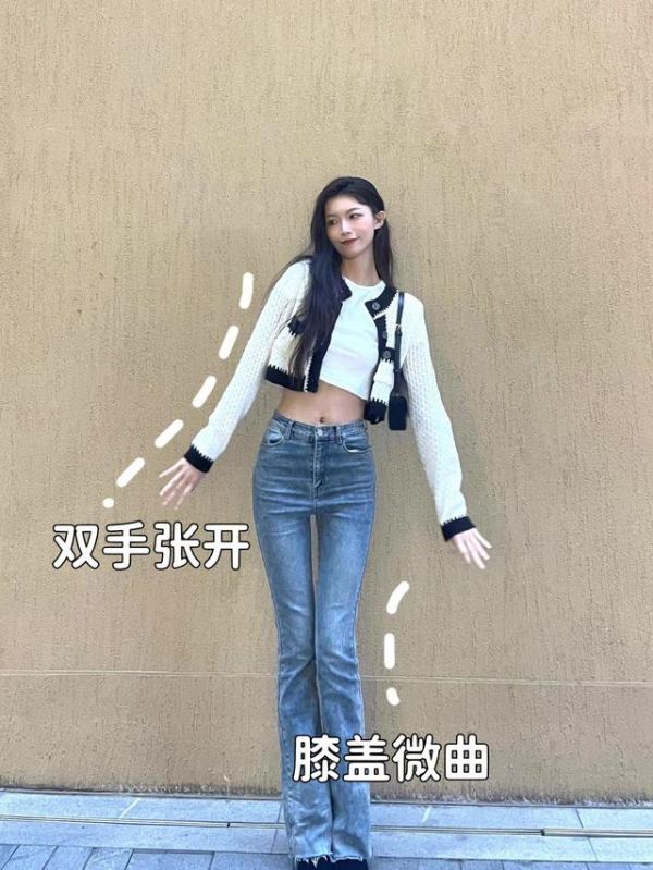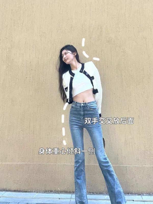 对于上半身较瘦的女生,拍照时可以双手环抱着拍,环抱时微微耸肩,并且适当地抬高手的位置,这样能提高腰线,拉长腿的比例。