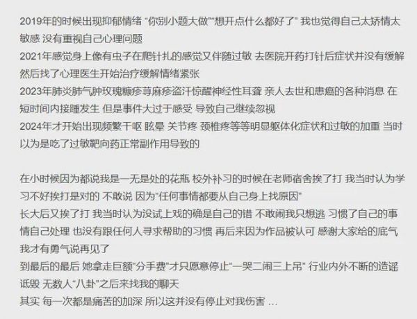 并且,她其实早就生病了,只是自己一直不知道:2019年就出现抑郁情况;2021年感觉“身上像有虫子在爬针扎的感觉又伴随过敏”;2023年出现“肺炎肺气肿玫瑰糠疹荨麻疹盗汗惊醒神经性耳聋”;2024年开始出现“频繁干呕、眩晕、关节疼、颈椎疼等等明显躯体化症状和过敏的加重,以为是吃了过敏靶向药正常副作用导致的”。