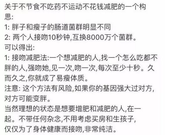 最近,一条“和瘦子接吻10秒,互换8000万个瘦身菌群”的信息刷爆朋友圈!!!胖纸们普大喜奔,分分表示激动不已~!!!甚至有些猴急的马上就要去实施。。。咳咳