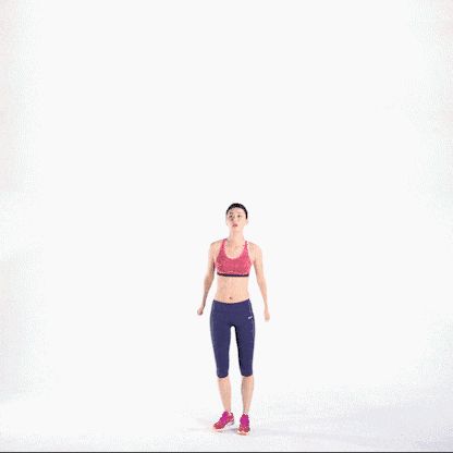 这个训练动作练习者要先让自己身体站直,然后做一个标准的深蹲练习,接着让身体站立起,起身的同时双腿发力让自己跳跃起来,跳起来的时候要让自己有足够的爆发力,身体核心部位收紧。