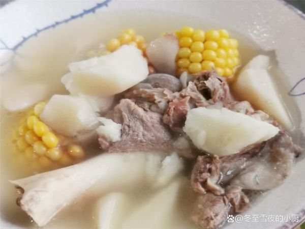 【山药玉米骨头汤】所需材料:猪大骨棒1根、山药1根、鲜玉米1根、枸杞7-8粒、盐适量、葱1段、姜3片、料酒2汤匙、白胡椒粉1茶匙、