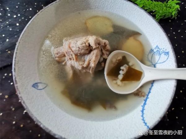 【薏米海带大骨汤】所需材料:猪大骨棒1个、海带适量、薏米半碗、盐适量、姜2-3片、料酒半汤匙、米醋几滴、