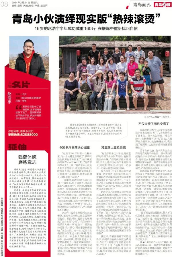 随着电影《热辣滚烫》的热映,“贾玲减重100斤”屡次登上热搜,激励了众多影迷。而在青岛,一名16岁的高一男生有着与“贾玲”相同的经历,短短半年之间,他从原先的400多斤健康减重160斤。男生名叫赵浩宇,目前就读于国科大(青岛)附属学校。