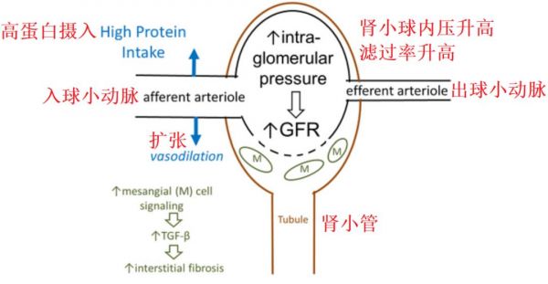 从机制上讲,高蛋白摄入可能导致系膜基质扩张、肾小球硬化、肾小管间质纤维化等。这可能和促炎基因表达、血管舒张的内分泌介质(如胰高血糖素和IGF-1)的变化、以及肾脏内神经激素反应(即管球反馈)有关。