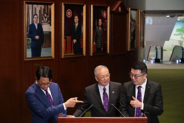 三名中大校董刘国勋、张宇人和邓家彪见记者。(图源:“香港01”)