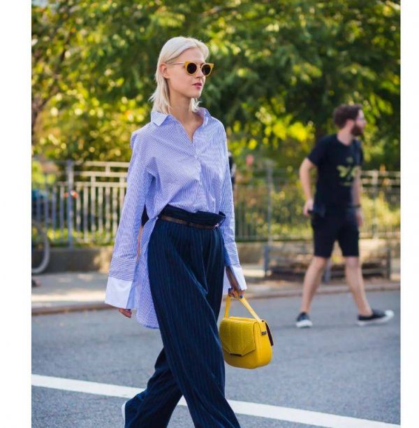 “纸袋裤”其实就是高腰阔腿裤,宽松的裤腿配合腰带,将腹部那一部分束起来穿的方式,这也就成了它的标志,看起来就像用绳子扎住的纸袋,腰部有外扩散开的叠褶。所以十分修饰腰部线条,突出层次立体感!