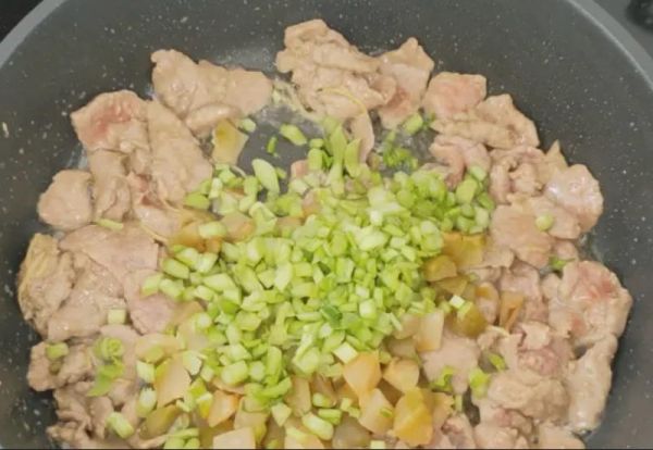 第八步:牛肉片炒至变色后倒入榨菜,青菜粒,一起翻炒把食材炒至断生,这一步也是很快的,一定要调猛火爆炒,这样炒出来的牛肉才香嫩。