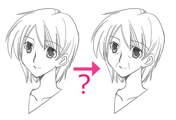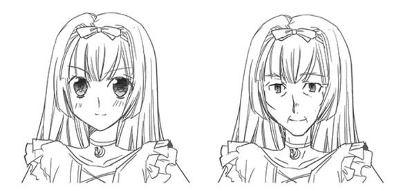 “小孩与大人”、“大人与老人”等不同年龄段的人,这些年龄层的人在画法上有何区分,还有就是针对不同的年龄特征如何来表现? 一般擅长角色作画的人大多都只会画初中到高中这个阶段的年轻男女。就算能够把这个年龄段的人物表现得具有魅力,但是在需要对中年男女进行设计时却无法很好的捕捉到他们的特征。所以这次我就为大家带来关于如何针对年龄层来进行画法上的区分。 只是增加皱纹是行不通的 首先让我们看一下下图。 左边是少女,右边则是这个少女在年龄增加后的样子,只是增加了皱纹的描写。