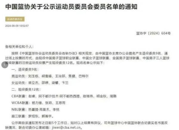 中国篮协近来经过提名与投票程序选出了新的一批运动员委员会成员。
