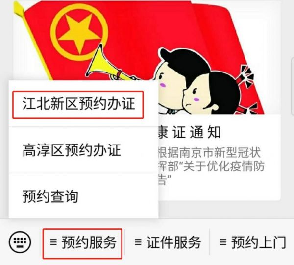 1.进入“健康证服务”微信号,点击下方菜单栏“预约服务”-“江北新区预约办证”。