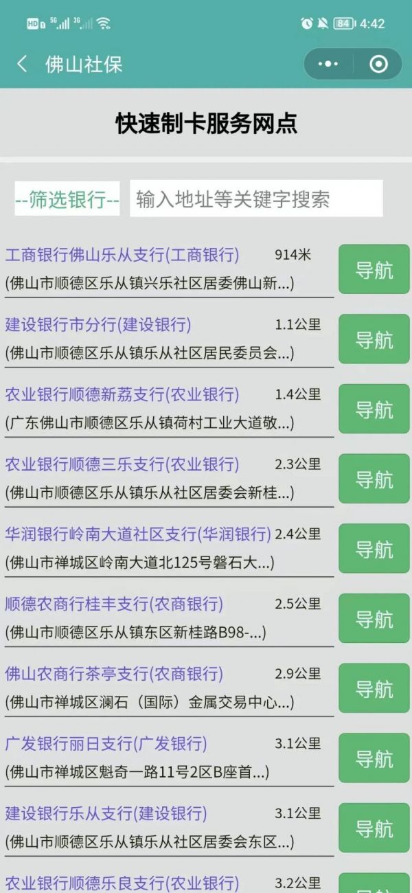 快速发卡服务网点地址查询:通过“佛山社保”微信公众号,点击菜单栏“社保卡服务”—“社保卡业务办理”—“快速发卡网点”。
