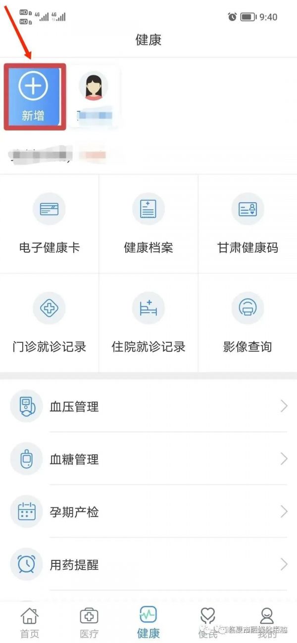 3. 进入健康页面后点击最上方的“新增”,按流程增加需要代申领健康码人员。