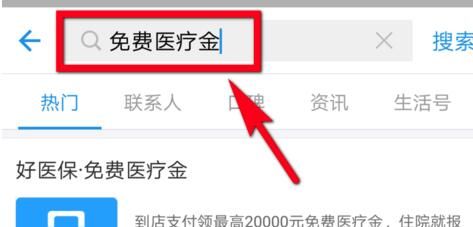 1、进入支付号以后,点击一下在页面顶端的搜索栏,然后输入【免费医疗金】。