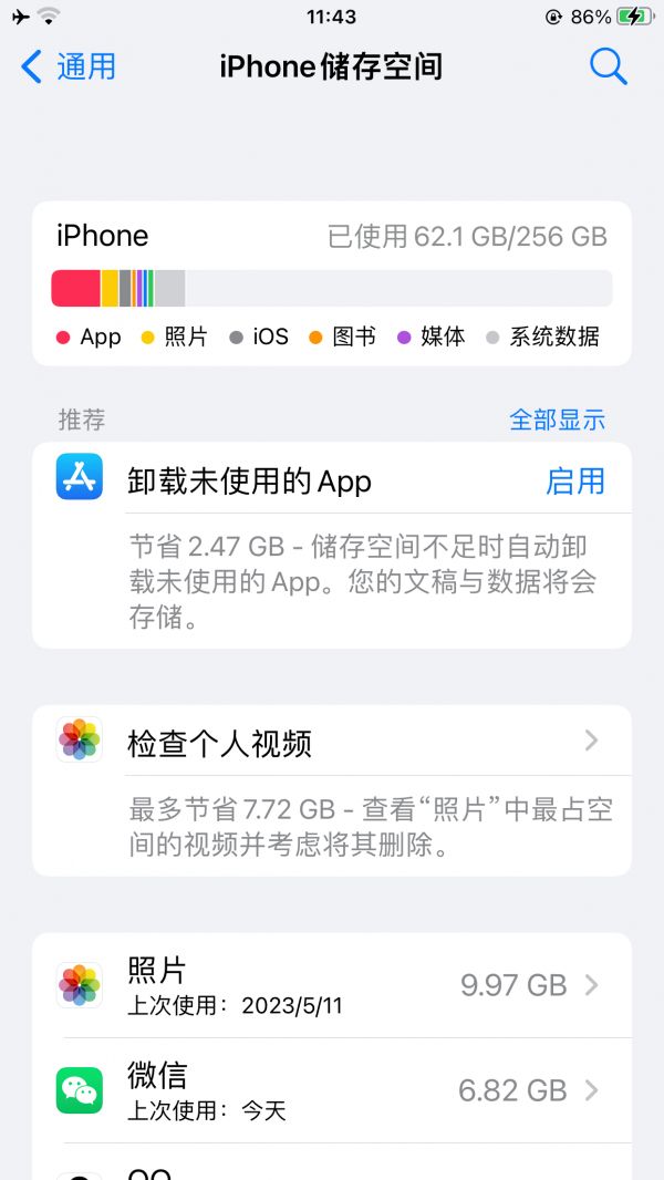 请前往“设置”>“通用”>“[设备] 储存空间”。会看到一个设备储存空间优化建议列表(可以开启,自动删除不用的app),后面还会有一个列有已安装 App 和各个 App 所占用储存空间量的列表。如上图,可以看到,我们常用的某通信软件占用了仅10G的空间,我看可以点开,对其进行深度清理,