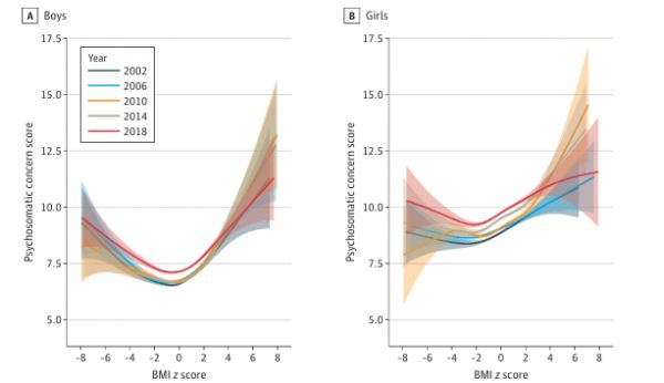 与健康体重的青少年相比,体重低、超重或肥胖的青少年的心身症状增加,而体重不足的青少年症状较少,在不同年份、性别和年级观察到这种关联,表明与青少年心理健康广泛相关。