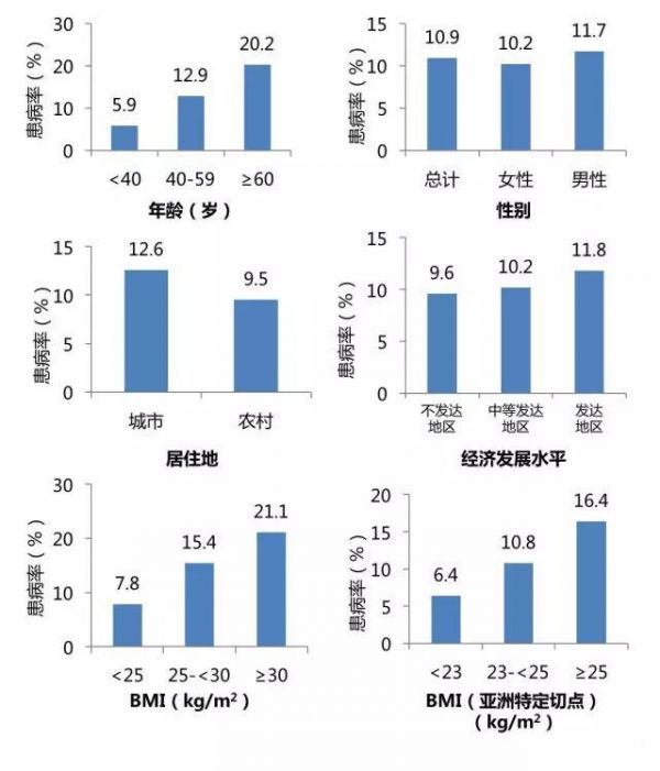 中国成人糖尿病总体患病率为10.9%(女性患病率为10.2%,男性患病率为11.7%)。其中,4%为之前已诊断糖尿病患者,6.9%为新诊断的糖尿病患者。