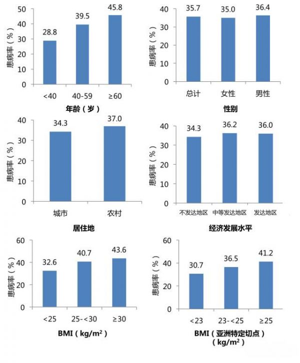 老年人群(P<0.001)、超重和肥胖人群(P<0.001)(尤其是采用亚洲特定BMI切点时,P<0.001)、农村居民(P=0.02)的糖尿病前期患病率更高。