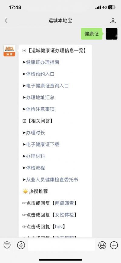 温馨提示:微信搜索公众号【运城本地宝】,关注后对话框回复【健康证】可获运城健康证体检预约入口+办理地址+办理入口+查询入口+电子健康证+办理流程+办理材料+注意事项等。