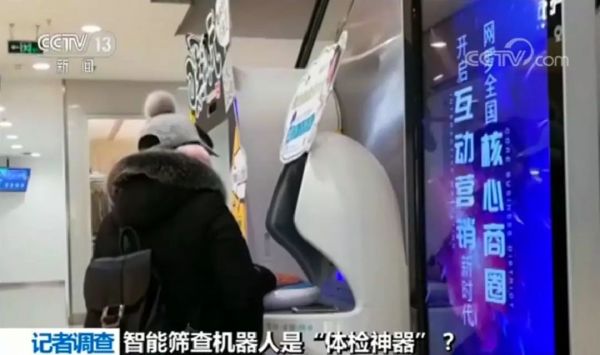 在北京一家商场的过道和出口处,记者都发现了这款名为康加智能筛查机器人的仪器。这款仪器机身高约1.5米,操作界面包括摄像头、电子显示屏和手掌传感器。机身顶部和旁边都悬挂着广告牌,上面醒目地写着“人工智能帮您远离亚健康”的字样,十分吸引眼球。