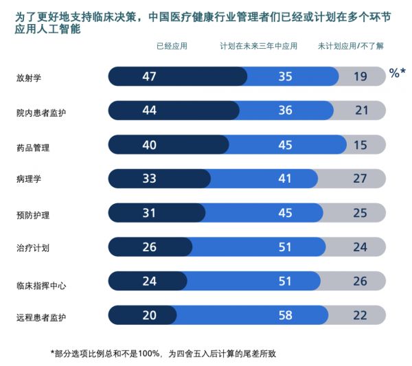 根据 2024 年飞利浦中国版《未来健康指数报告》数据显示,86% 的医疗机构管理者受访者表示已布局或计划投资生成式 AI,这一比例显著高于美国的 75%。而在具体应用场景方面,47% 受访者表示已经在放射科部署 AI,44% 在院内患者监护中应用 AI,40% 在药品管理环节应用 AI。