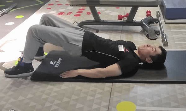 仰卧状态,双脚打开,臀大肌发力抬起臀部,这个动作适合腰肌劳损跟腰间盘突出的人锻炼。动作进行4组,每组15-20次次。
