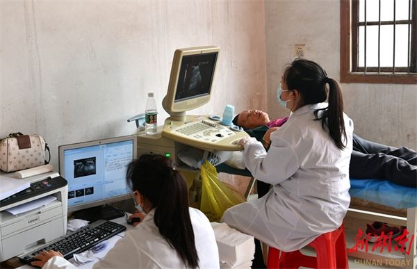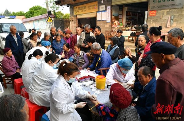 The photo, taken on April 17, shows medical staff giving physical check-ups to elderly persons at Yanbatang Village, Huayuan Town, Huayuan County. In recent years, the health center of the town has regularly organized medical staff to the elderly people's homes to provide free physical check-ups and monitored their health conditions. (Photo/Long Enze)