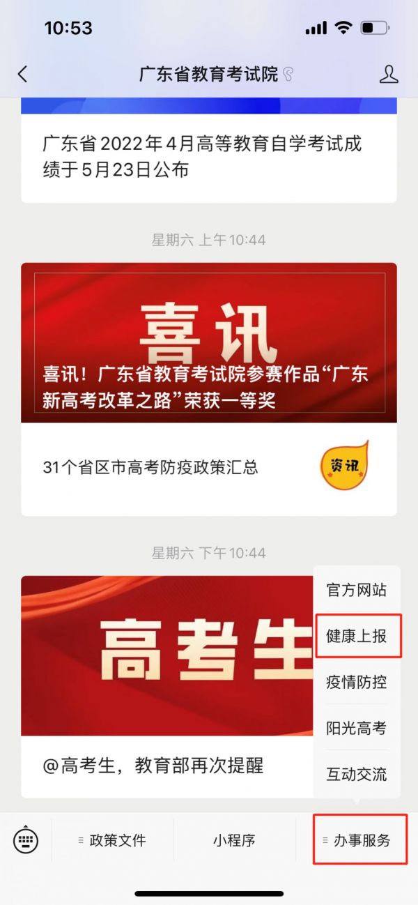 在广东省教育考试院公众号菜单栏点击【办事服务】,选择【健康上报】;