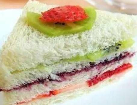 2.取1片吐司片放上草莓,盖上1片吐司片涂上蓝莓酱,再盖上吐司片放上猕猴桃片,最后再盖上1片吐司片,将吐司对切成三角形即可。