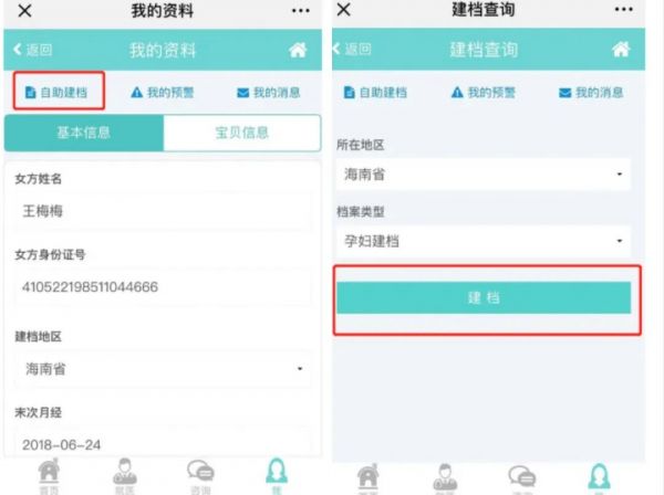2、完善基本信息后,点击左上方的“自助建档”按钮,进行自助建档,建档类型选择孕妇建档。(如果妇幼系统已经有档案,不需要使用自助建档功能)
