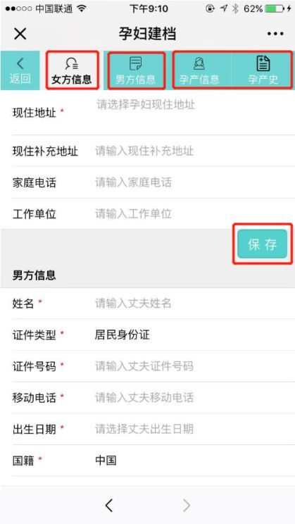 3、进入孕妇建档界面录入信息,其中各个项目中带星号的为必填项。女方信息、丈夫信息以及建册信息可以单独保存更新,其中需要首先保存女方信息。