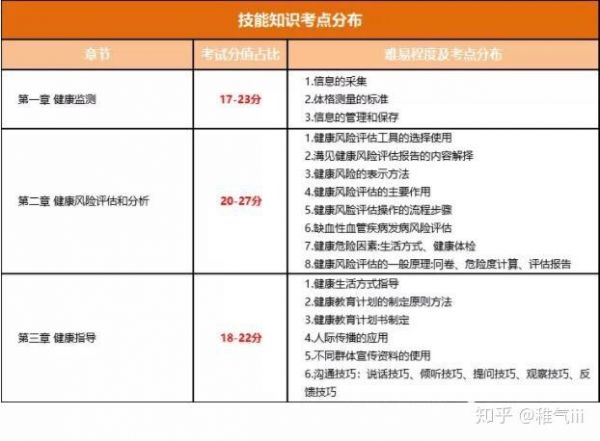 《健康管理师基础知识》主要考察考生对健康管理师的职业定义、职业功能、职业道德、健康管理的基本理论、方法和技术等方面的掌握程度。《健康管理师专业技能》主要考察考生运用健康管理的基本理论、方法和技术,进行健康风险评估、健康监测、健康教育、健康咨询、健康干预等工作的能力和水平。