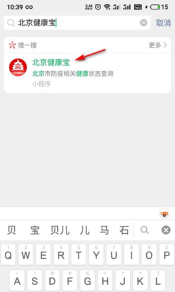 打开微信,点击搜索按钮,输入“北京健康宝”,如下图所示,就会搜索出来“北京健康宝”小程序,点击进入。