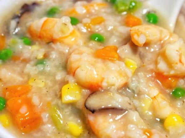 准备食材:大米,鲜虾,香菇,胡萝卜,玉米粒,豌豆,青菜,葱花。