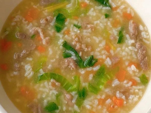 1、大米淘洗干净沥干水分备用。牛肉清洗干净切成薄片,加入料酒、生抽、淀粉、食盐、姜丝,抓拌均匀腌制15分钟。青菜清洗干净切碎,胡萝卜去皮后切成丁。