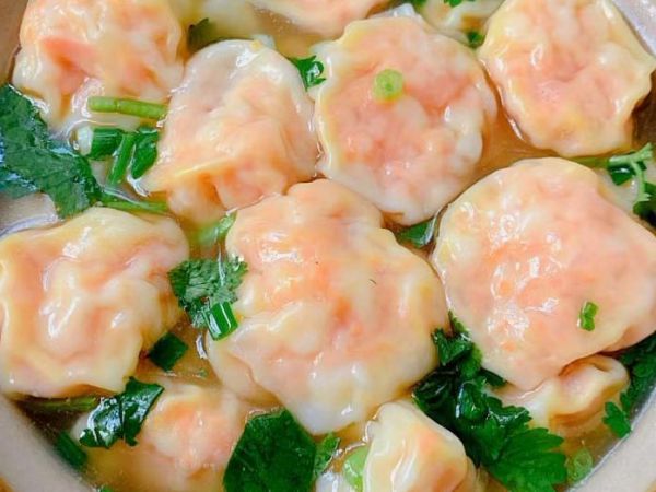 2、准备云吞皮,取一点馅包进去,包成个云吞就可以了。起锅烧水,水烧开后放入包好的云吞,煮至云吞浮起来,再盖上盖子继续煮一分钟。