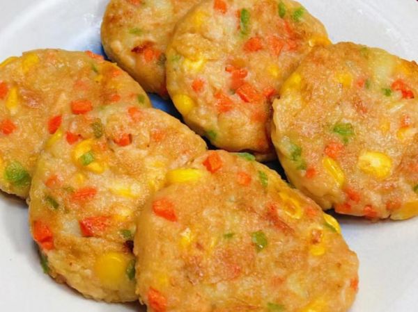1、土豆去皮切成片,放蒸锅上蒸熟,然后取出来趁热压成泥。鸡胸肉清洗干净切成丁,加入淀粉、食盐、生抽,抓拌均匀腌制十分钟。玉米粒清洗干净沥干水分备用,胡萝卜去皮洗净后切成丁。