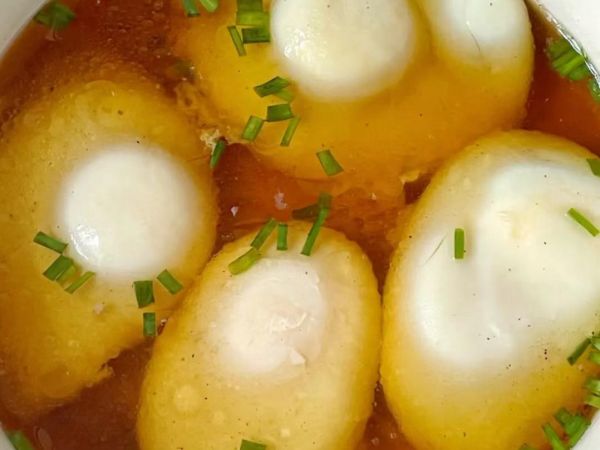 3、再将煮熟的鸡蛋捞起来放入刚刚调好的汤汁里面,一道超级好吃的水煮荷包蛋就做好了,是不是很简单啊?