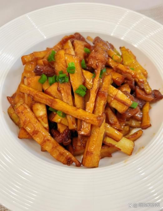 7. 收汁和装盘:待汤汁稍微收浓后,加入少许鸡精提鲜(可选)。将春笋盛出,放入盘中,最后撒上一些葱花点缀增色增香。