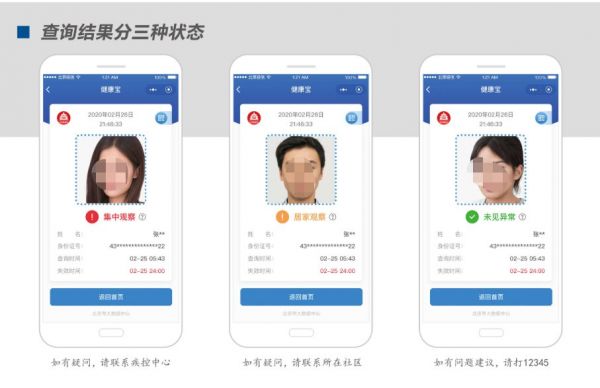 根据查询结果健康状态有“集中观察”、“居家观察”、“未见异常”三种状态,分别用红色、黄色、绿色三种颜色进行标识。