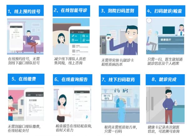 电子健康卡作为“就医凭证”,可替代就诊卡在就医全程使用,包括线上预约挂号、在线智能导诊、到院扫码(刷脸)签到、扫码(刷脸)就诊检查取药、在线缴费查报告等就医全流程。在疫情期间通过“非接触式”的就医方式,最大程度减少院内感染几率。