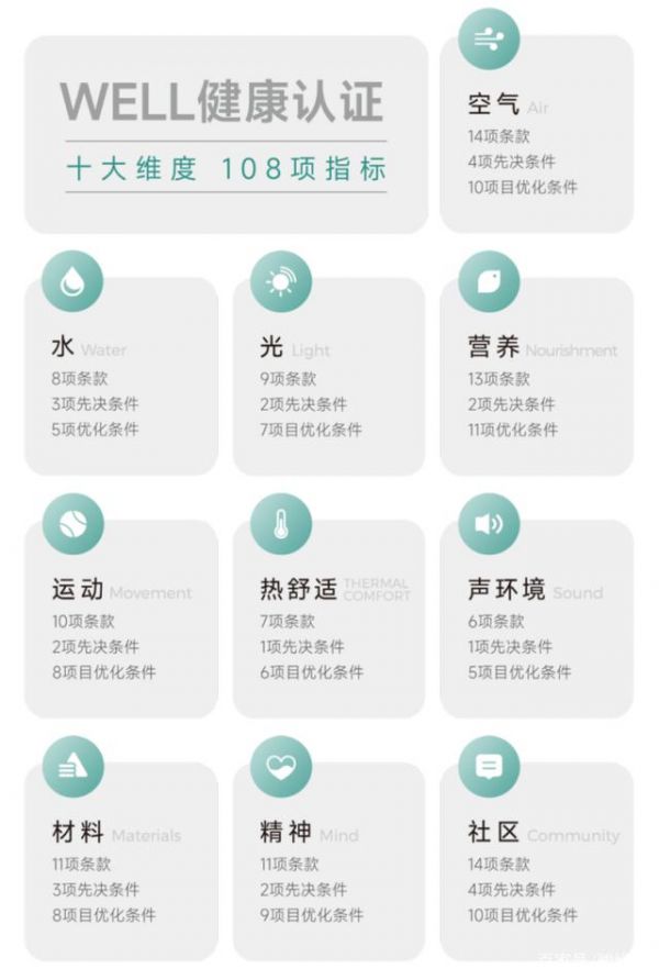 WELL健康认证是目前全球首个针对室内环境提升人体健康与福祉的建筑认证标准,含金量十足,被公认为是绿色建筑界的“奥斯卡”。其以医学研究为准则,着重于探索建筑与其居住者健康之间的关系,从人的健康系统需求对应建筑物设计来提升居住者的空间舒适感。