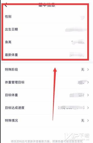 第四步,在【基本信息】界面的中下部,可以看到【体重管理目标】、【目标体重】、【目标达成速度】等选项,在这里大家可以根据自己的个人情况进行设置。