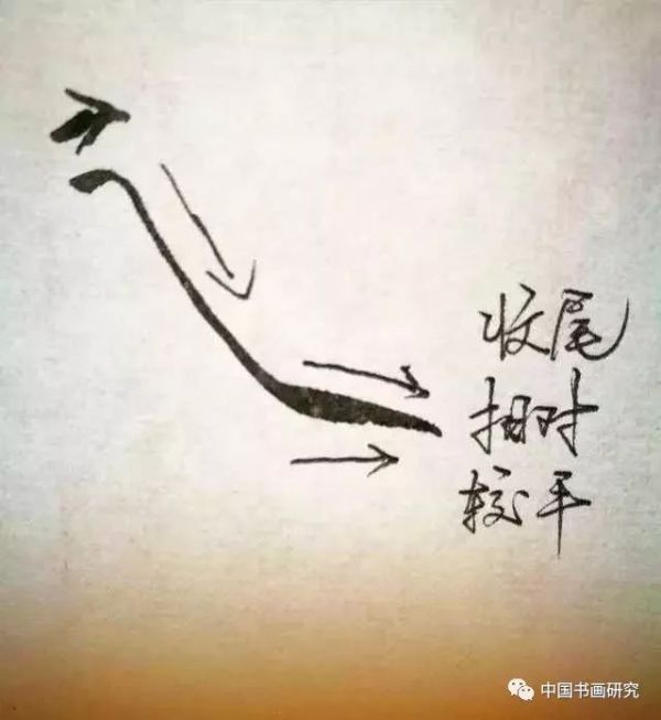 落笔时,先由左下向右上起笔,然后转锋向右下运笔,至底部时稍停笔蓄势,然后用力向右,弹出捺尾,收尾下部较平,但也有变化。