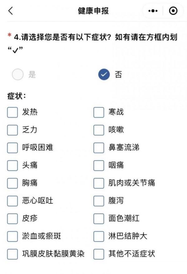 5、根据自身实际情况如实填报身体症状。如选择“是”,勾选对应症状;如选择“否”,无需勾选。