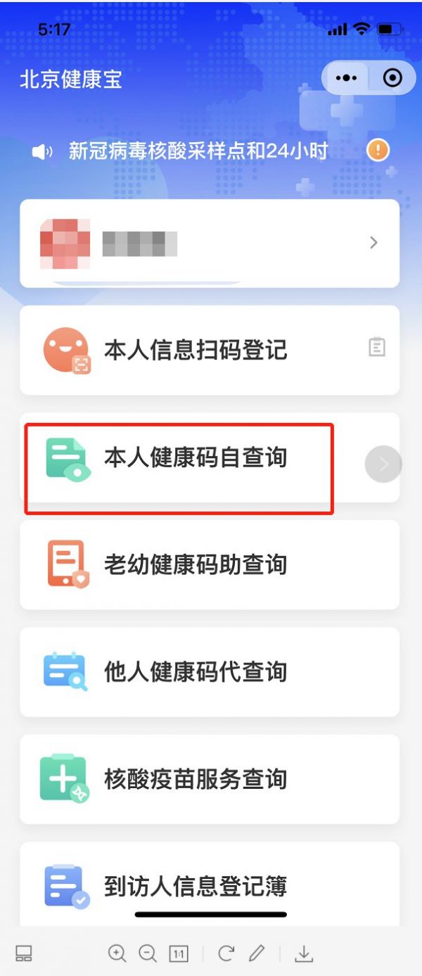 打开北京健康宝小程序,点击“本人健康码自查询”