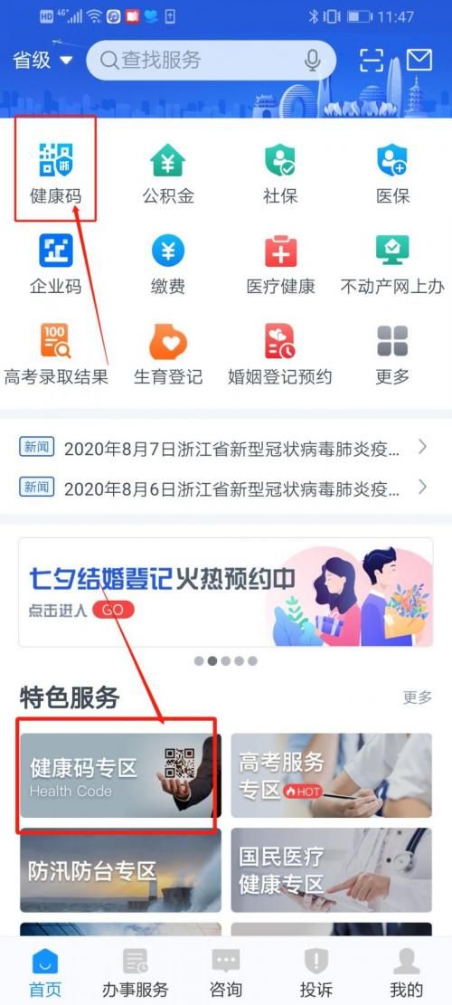 第三步:然后在首页找到健康码,然后点击“健康码”,即可领取浙江健康码。(如下图所示)