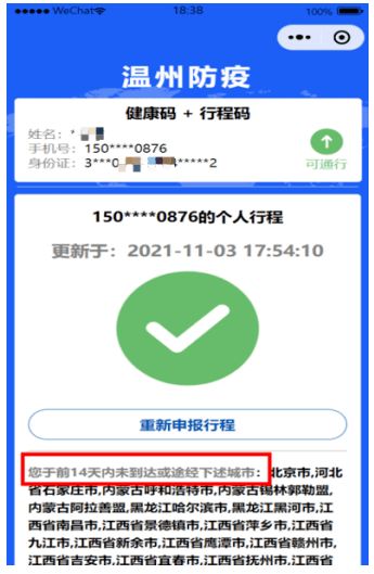(四)个人行程卡申报查看:一般授权查看信息后,有效时间内(有效时间根据当地疫情情况动态调整,一般在5-15个小时之间)都不需要重新授权,但如果发现行程信息过期或有误的,可以在“温州防疫”信息页点击“重新申报行程”再次授权查询行程信息并予以更新。