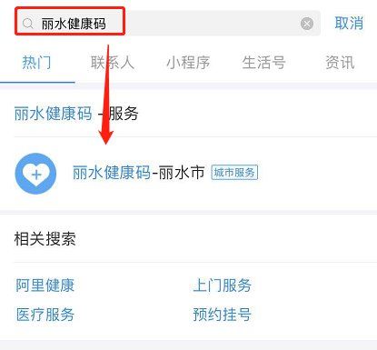 一、首先在支付宝上方的搜索框内,搜索“丽水健康码”,